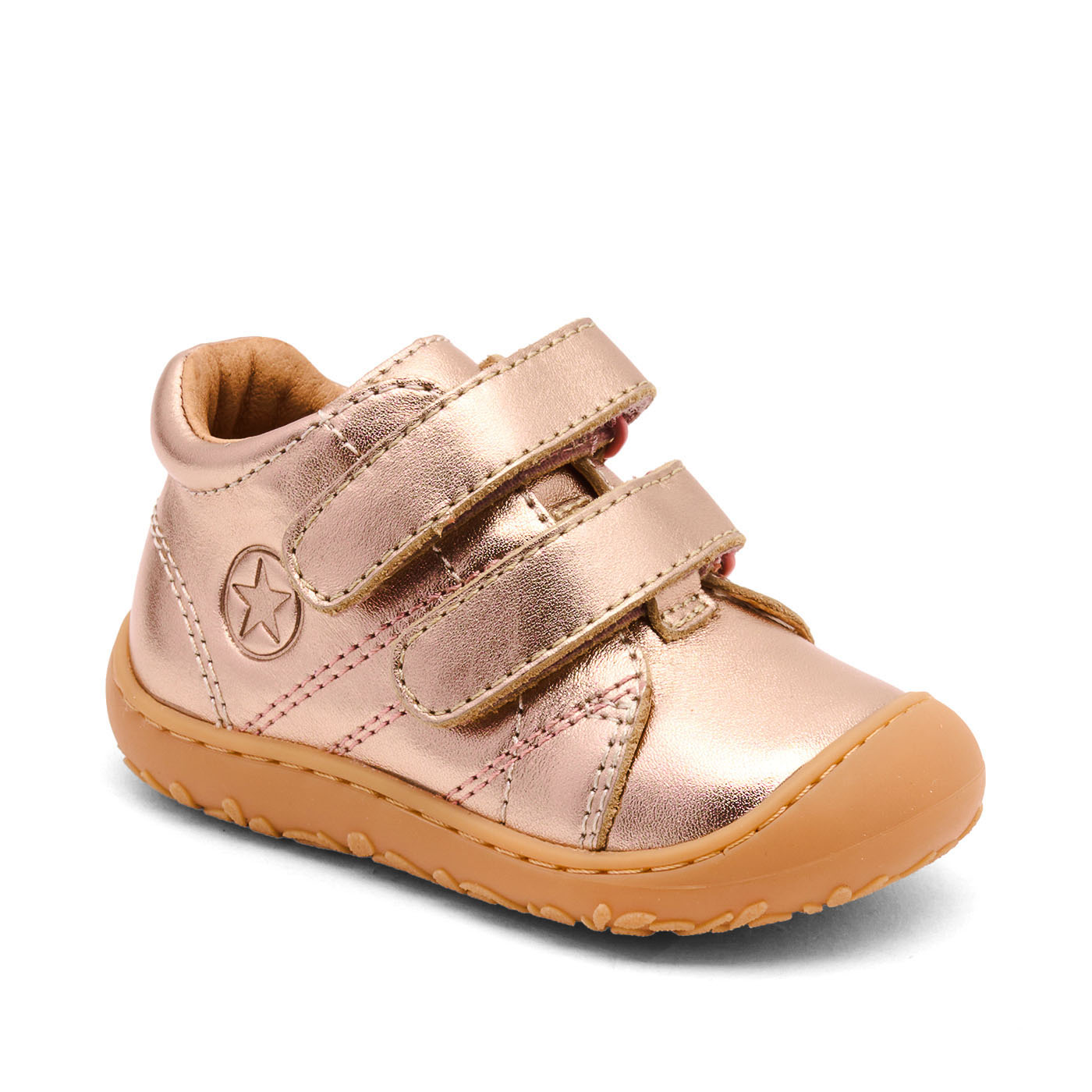 Super smarte Bisgaard sko i rosa skind. Skoen lukkes med 2 praktiske velcroremme og er beklædt med lækkert, blødt skind. I bunden er der en blød, ergonomisk lædersål.