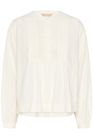 Smuk feminin bluse fra Culture. Blusen har kalvekrøs og små knapper ned foarn. På hver side af knaplukning er der også en fin bort med et hul mønster. Der er 3/4 lange ærmer med en smal elastikkant.