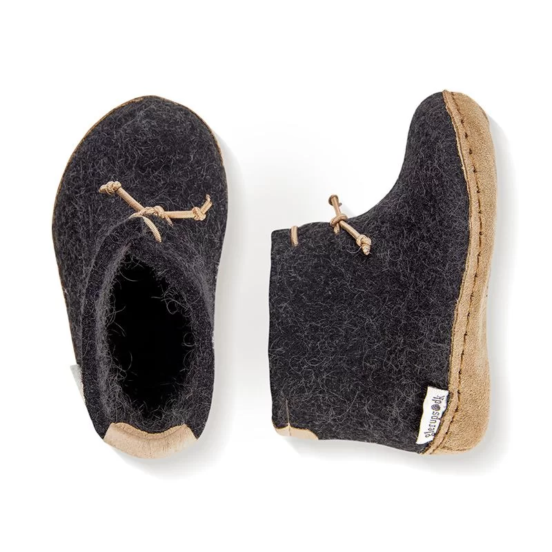 Uldhjemmesko med velcrolukning og en blød sål af ruskind og skridsikker gummi, der giver den optimale støtte. Hjemmeskoen er produceret i naturligt uld, der er lukket rundt om foden og samtidig giver foden plads til at vokse.