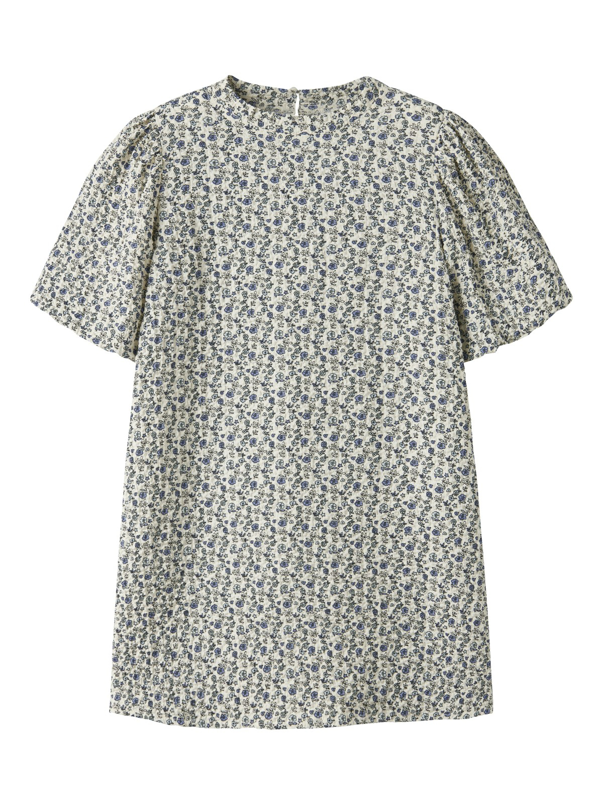 Super smuk kjole fra Name It i beige med fint blomsterprint over det hele. Kjolen har elastiske manchetter, knap og løkkelukning bagpå og er lav i taljen.