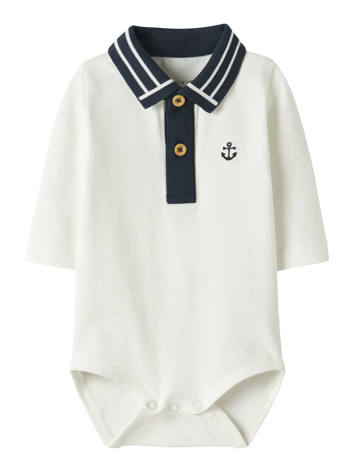 Super fin Hummel body til dreng i blå, og til pige i lyserød. Den er med lange ærmer, O-hals og med logo på front. Den har praktiske trykknapper på højre skulder og mellem benene.
