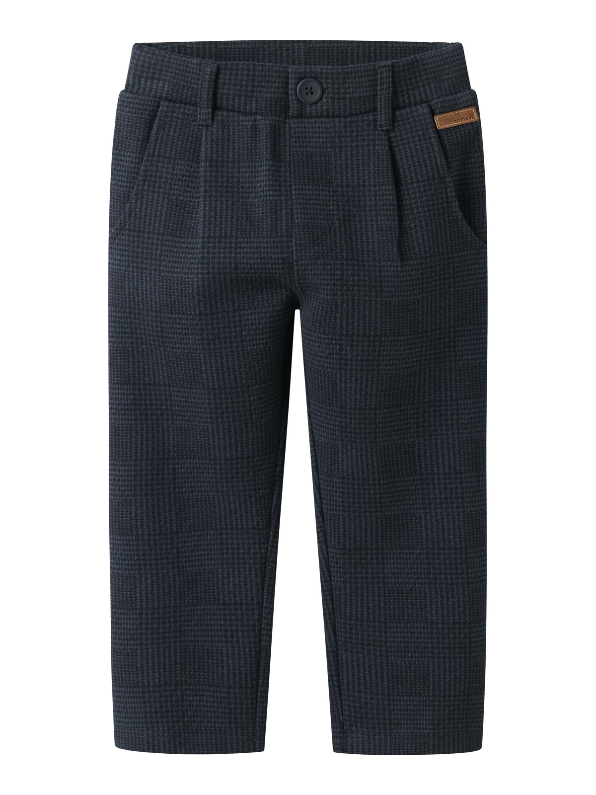 Mega cool Hummel bukser til dreng. De er i mørkeblå, hvor det nederste af buksebenene er brune. De er med lange ben og brede kanter. I livet har de en justerbar elastikkant, som kan strammes yderligere ind med en snøre fortil.