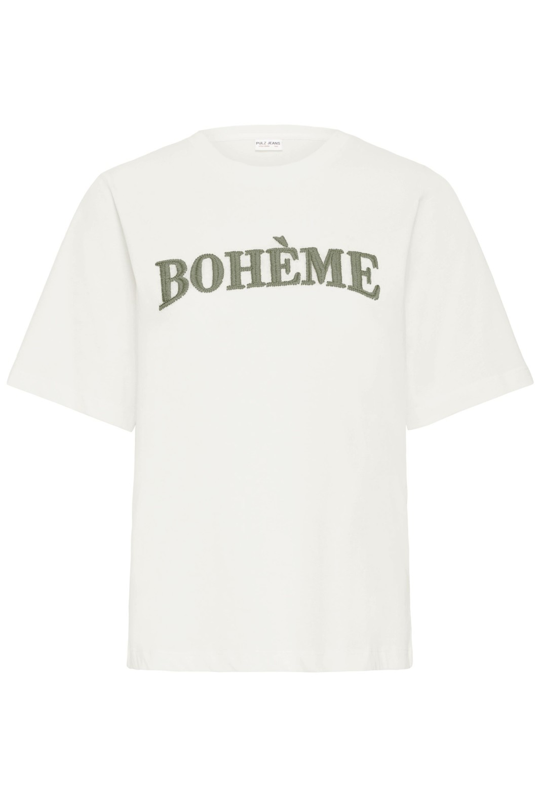 Skøn bomulds T-shirt fra Pulz Jeans. Dem har korte ærmer, rund halsudskæring og teksten "Boheme" er broderet på i en flot grøn nuance.