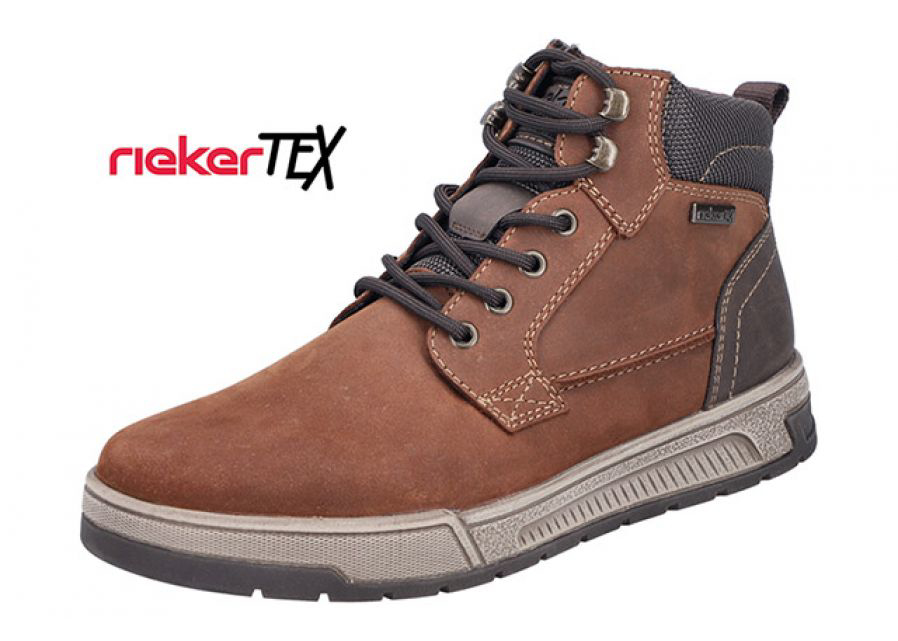 En flot Rieker støvle til herre i brun. Støvlen er med fine detaljer langs siden og bagpå samt en mørkere nuance på snuden, der giver et smart touch. Støvlen lukkes med lynlås i siden og snørres.
