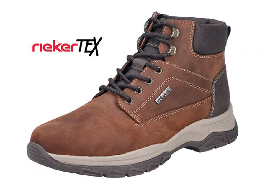 En flot Rieker støvle til herre i brun. Støvlen er med fine detaljer langs siden og bagpå samt en mørkere nuance på snuden, der giver et smart touch. Støvlen lukkes med lynlås i siden og snørres.
