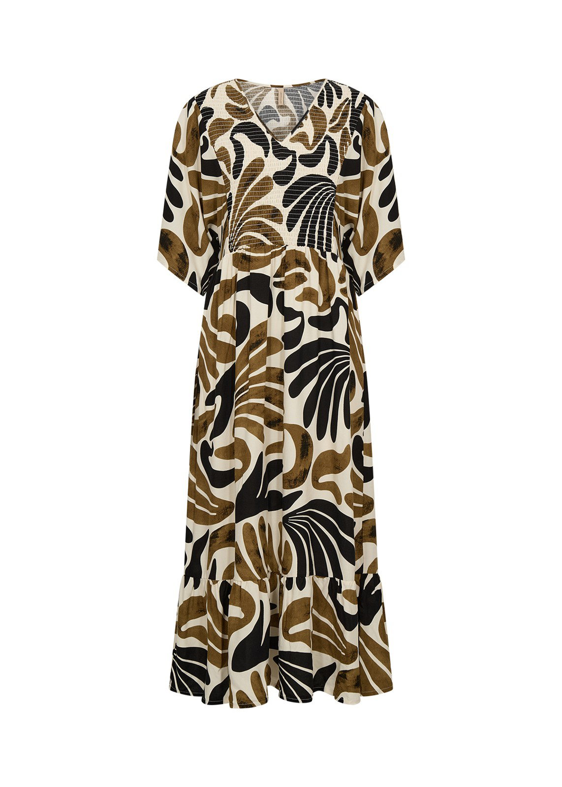 Soya Concepts Feldi kjole har et flot abstrakt print, v-udskæring, korte ærmer og en løs midilængde samt en bred smock kant på bærestykket.