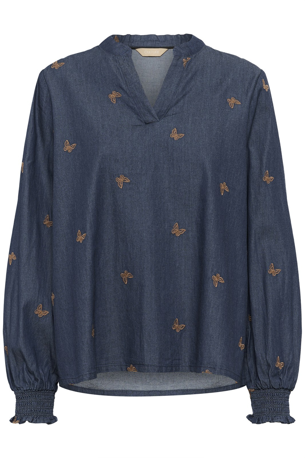 Super skøn denim bluse med sommerfugle broderi. Den er med V-hals og smock ærmer.