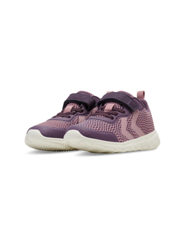Hummel skoene har elastiksnøre over foden og en praktisk velcrorem over vristen, så de let kan tilpasses. Bagtil er der en praktisk strop, så de er lette at få på og af. Indvendigt har de en let tekstilforing, mens der i bunden er en blød og udtaglig indersål. Skoene har en hvid letvægts AeroTech EVA-ydersål med en mønstret bund, så barnet er sikret et godt fodfæste.