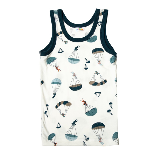 Forny dit barns basisgarderobe med blødt og komfortabelt undertøj til enhver alder. Super fint 2 pk tanktop til dreng. Den ene med dino print, den anden ensfarvet.