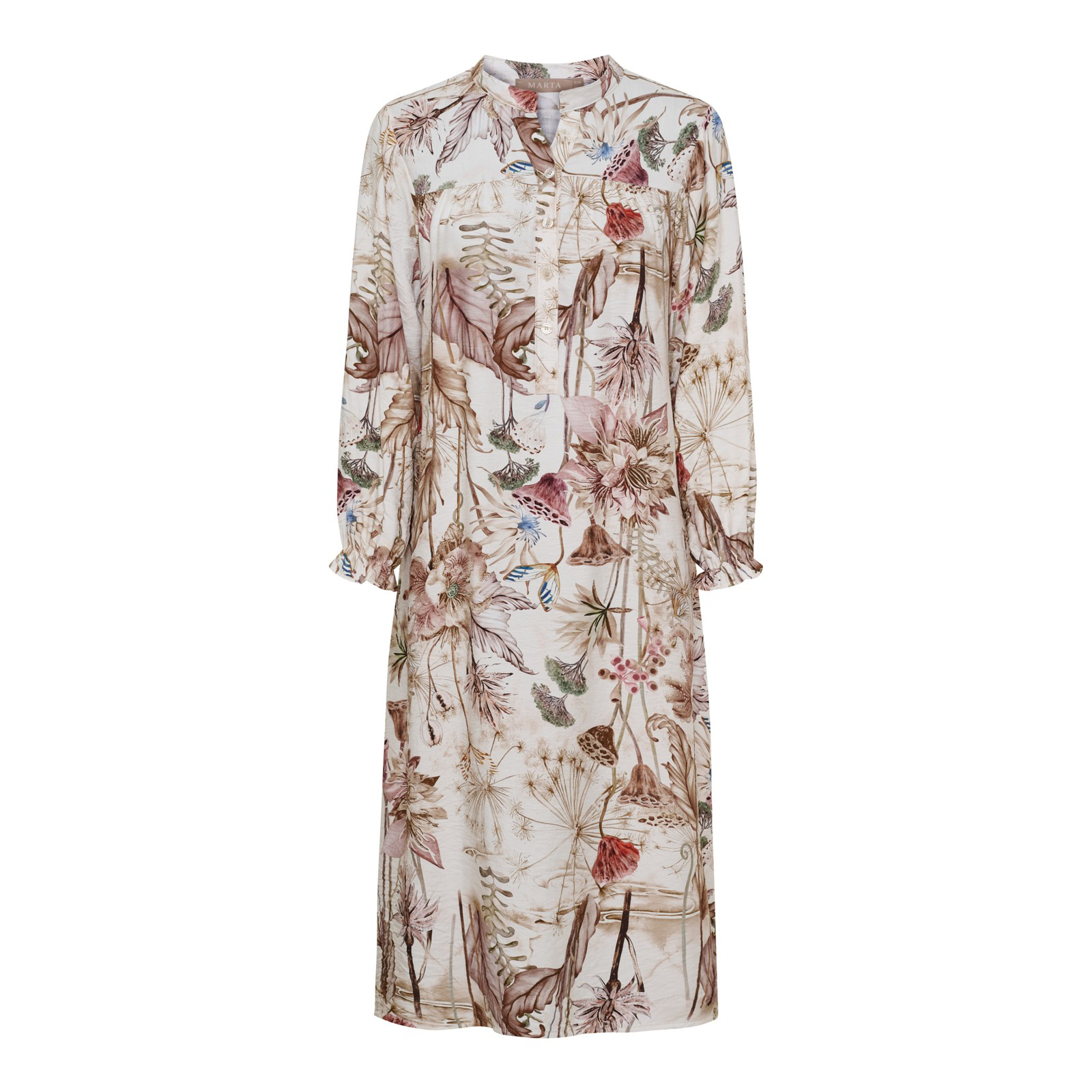 Let og feminin Marta kjole med et smukt blomsterprint i varme, afdæmpede nuancer. Den har en løs pasform, V-udskæring og knaplukning foran samt ærmer med let volumen og elastisk afslutning. Den bløde kvalitet og det elegante fald gør kjolen ideel til både hverdag og mere afslappede anledninger.
