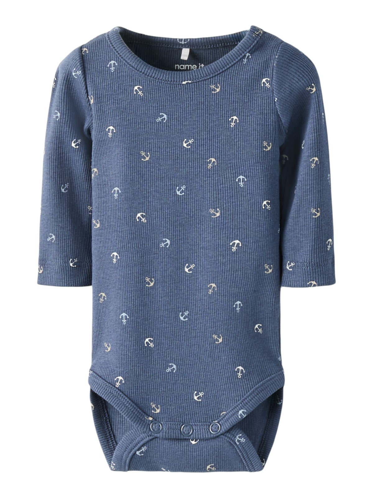 Super fin Hummel body til dreng i blå, og til pige i lyserød. Den er med lange ærmer, O-hals og med logo på front. Den har praktiske trykknapper på højre skulder og mellem benene.