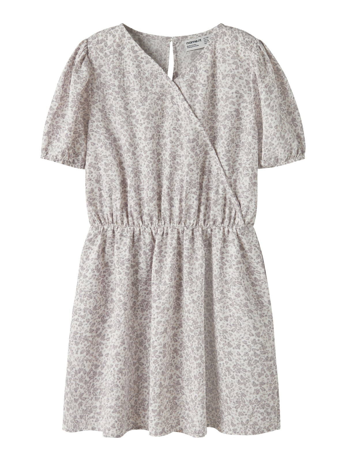Super smuk kjole fra Name It i beige med fint blomsterprint over det hele. Kjolen har elastiske manchetter, knap og løkkelukning bagpå og er lav i taljen.