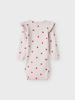 Super sød Hummel body i rosa eller grøn. Foran er der print med logo. Bodyen har lange ærmer med flæser, og den har praktiske trykknapper på venstre skulder og mellem benene.