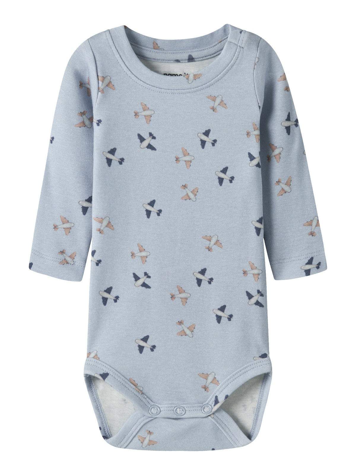 Super fin Hummel body til dreng i blå, og til pige i lyserød. Den er med lange ærmer, O-hals og med logo på front. Den har praktiske trykknapper på højre skulder og mellem benene.