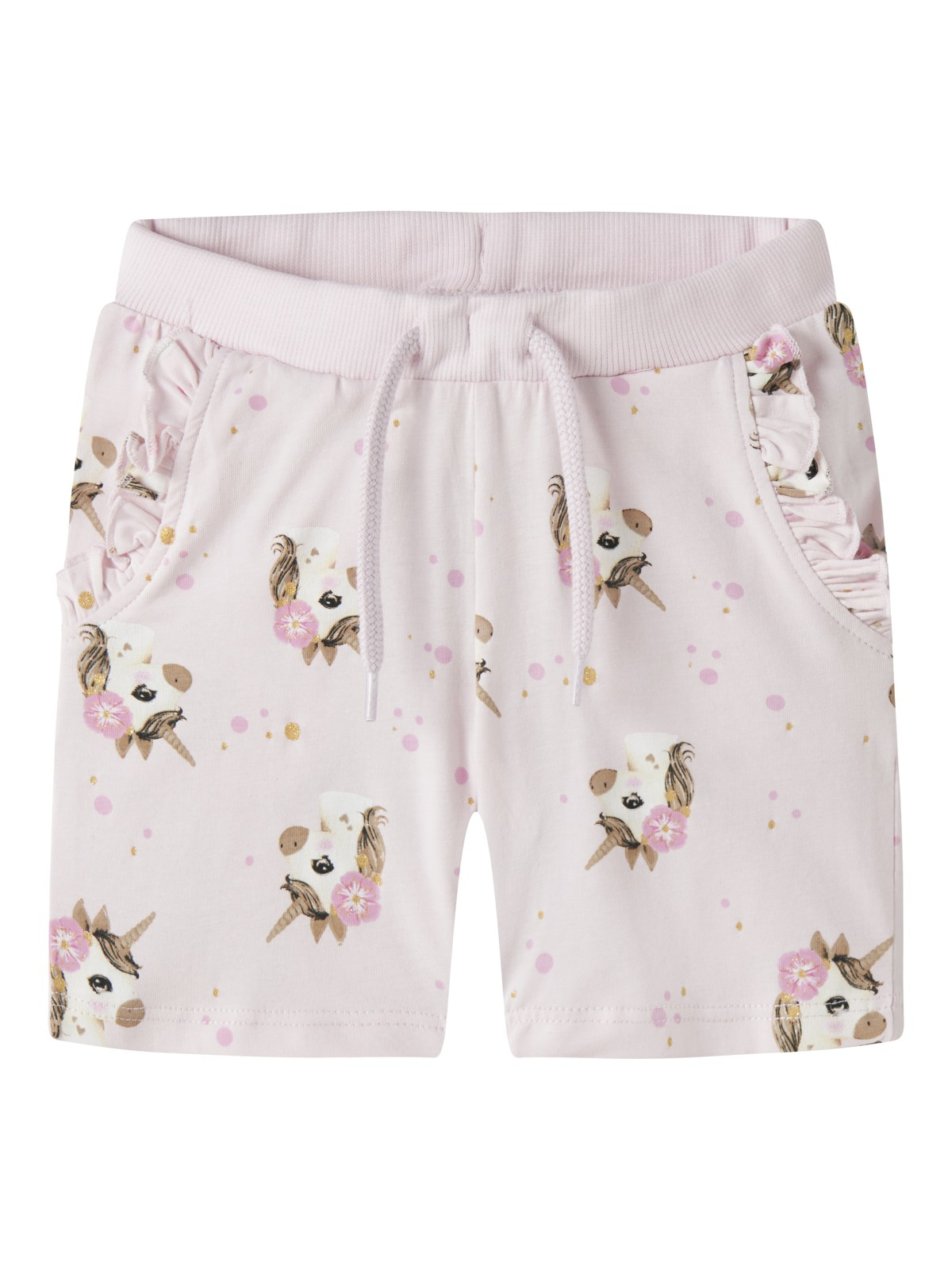 De sødeste Salli shorts fra Name It. Shortsene har trykknaplukning og halv, falsk gylp. Modellen er slim fit og du kan dertil justere elastikket i taljen efter behov.