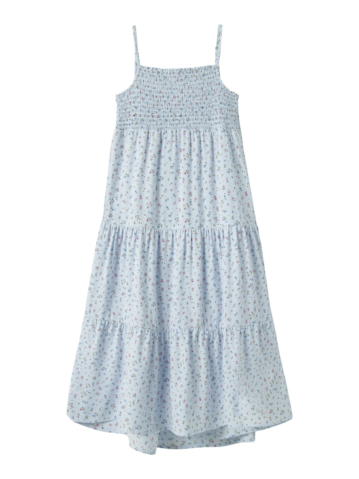 Super smuk kjole fra Name It i beige med fint blomsterprint over det hele. Kjolen har elastiske manchetter, knap og løkkelukning bagpå og er lav i taljen.
