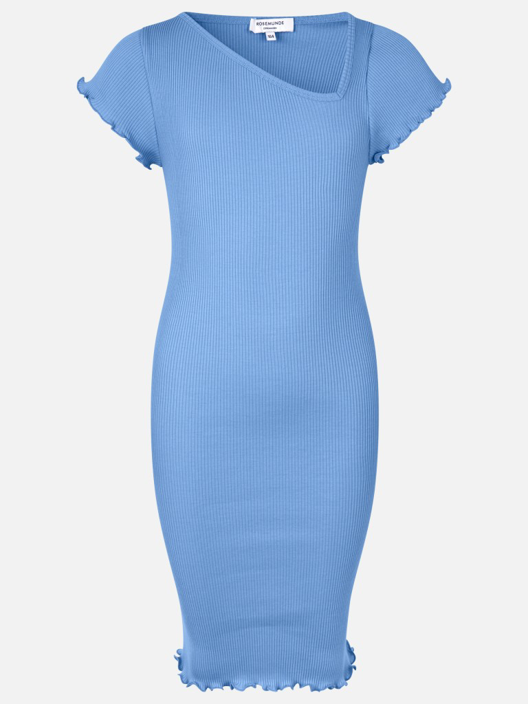 Kjolen har firkantet udskæring med flæsekant. Rynket søm i taljen og underdel med let vidde.