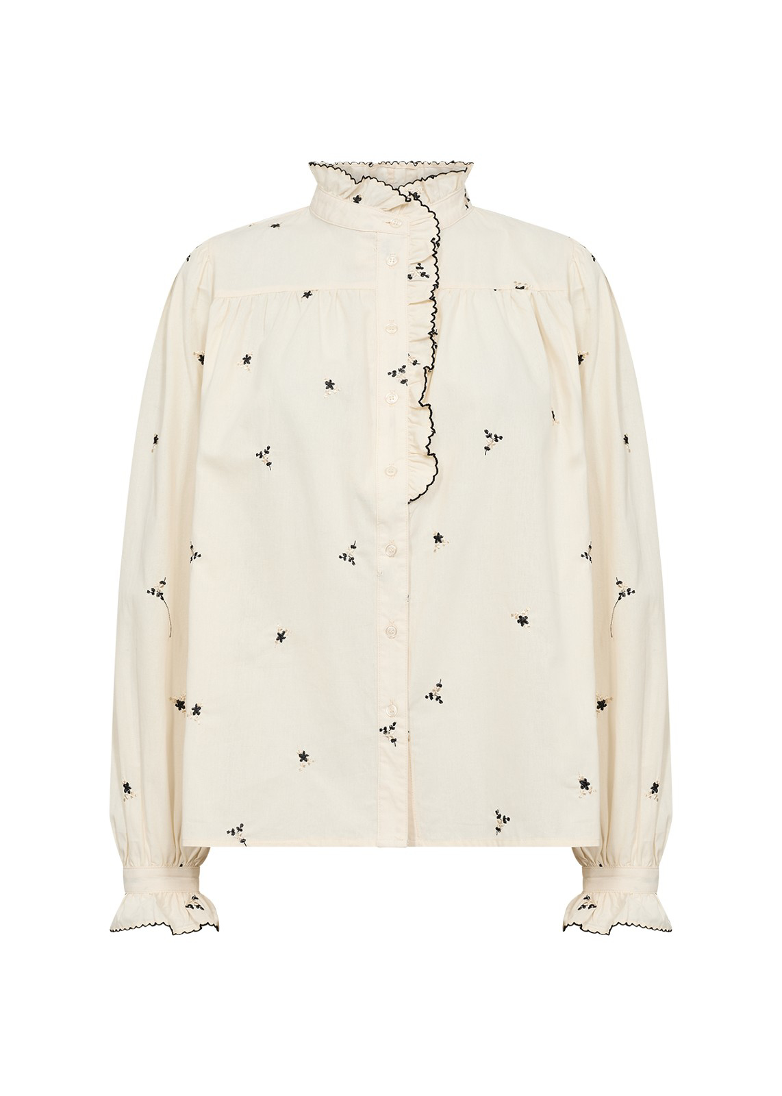 Smuk og feminin skjorte bluse fra Soya Concept. Den har en høj krave med flæser, en fin knaplukning foran og blomsterbroderi.