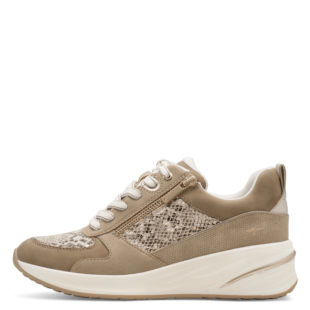 Super cool Ecco sko. Skoen er lavet af en blanding af glat skind og tekstil i farverne hvid, lys sand og guld. Indvendigt er skoen foret med lyst tekstil og er med Ecco´s biom indlægssål. Mellemsålen er lys sandfarvet EVA, som giver skoen en god stødabsorbering.