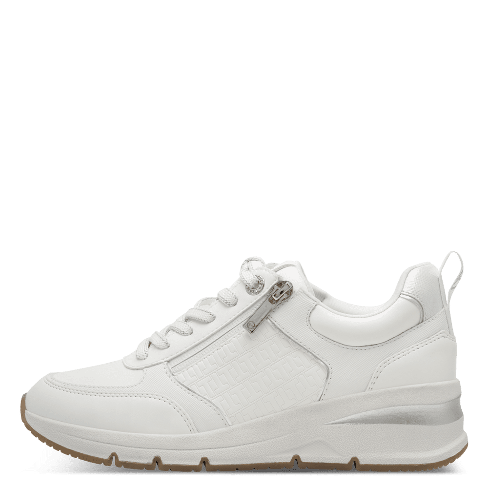 Smart ECCO damesneaker i lækkert hvidt skind med struktur. Skoen har hvid snøre. Den har brune skind-detaljer på bagkappe samt en hvid skind-dæksål. Skoen er både fin til hverdag, men også til fester. OBS: Der står ikke Ecco logo på ydersiden.