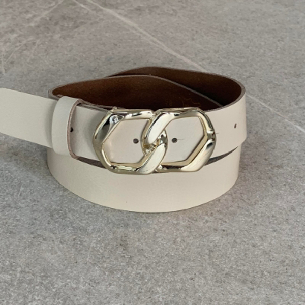 Bælte i ægte læder i en flot kit farvet nuance med et super flot og dekorativt spænde i guld.