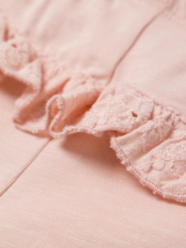 Super sød Hummel body til baby pige med flæser ved skulder. Den har korte ærmer og er i en skøn coral med hvid og lys rosa nuancer. Den har rund hals og praktiske trykknapper på venstre skulder og forneden.