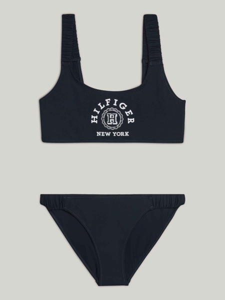 Super lækker Tommy Hilfiger bikini enten i rød eller navy med print af logo og tekst "Tommy Hilfiger" i hvid på kanten af overdelen. Underdelen har matchende logo print bagpå. Bikiniens overdel er en crop top model med brede stropper med bryderryg. Underdelen har en bred elastikkant i livet.