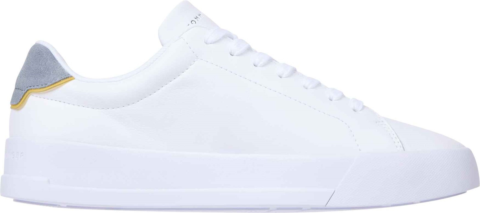 Super lækre skind sneakers fra Tommy Hilfiger til drenge/herre. De er hvide med gråt ruskinds detaljer på hælkap og en karrygul kant. Grå indersål og en rigtig solid bund for et godt fodfæste.